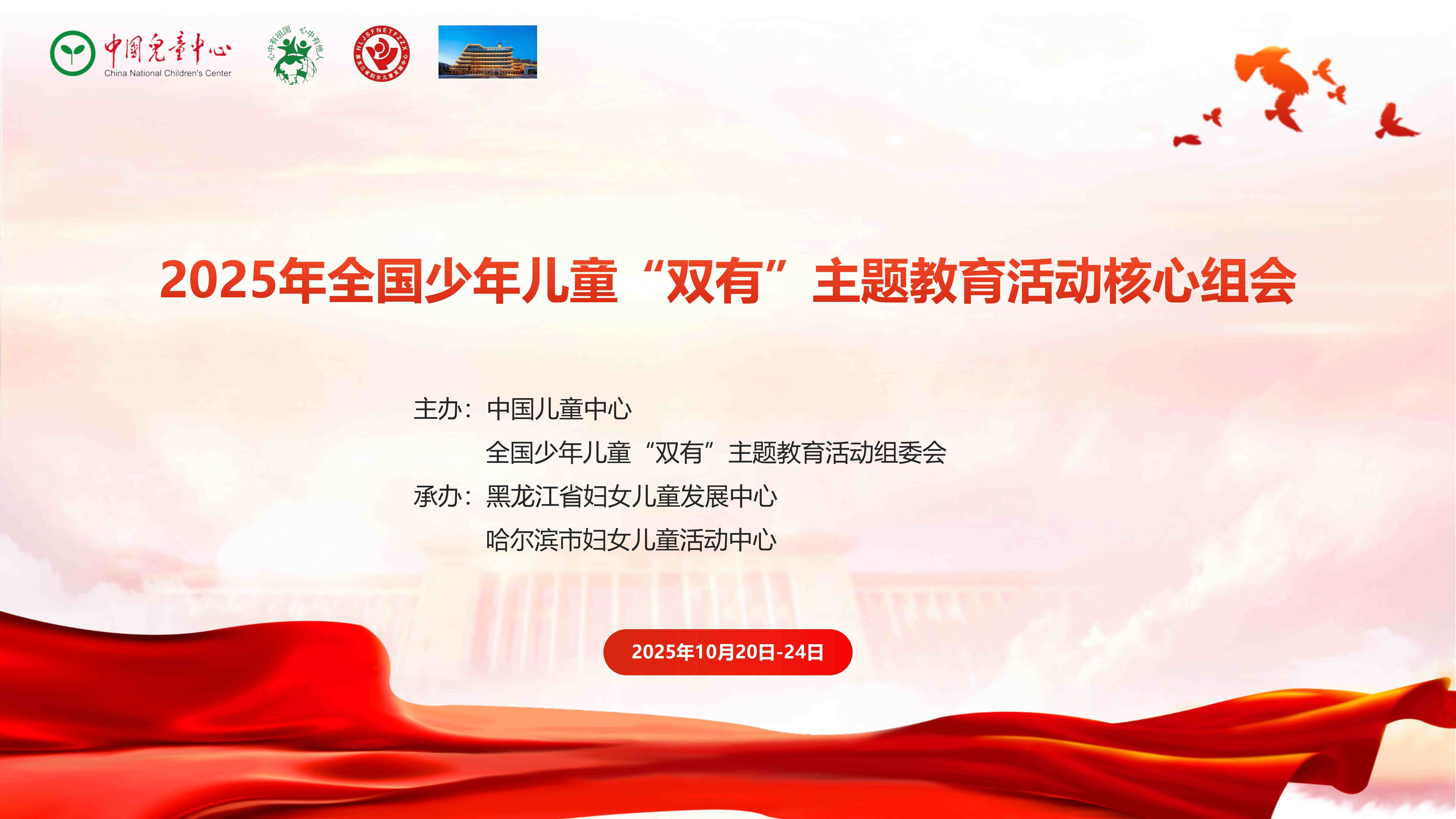 2025年10月20日-10月24日,2025年全国少年儿童“双有”主题教育活动核心组会在黑龙江省哈尔滨市举办。本次会议集结全国校外教育同仁,在教育强国建设的新征程上,统一思想、提高认识、推进落实,进一步强化“双有”活动育人功能,促进校外教育高质量发展。