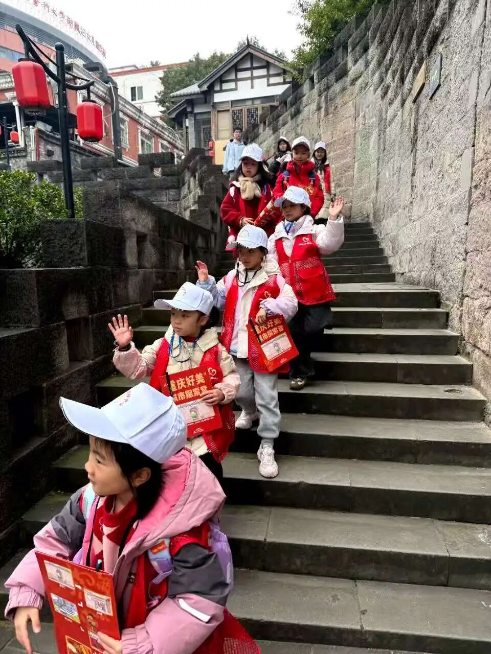 活动首站从渝中母城拥有六百年历史的通远门开启。孩子们跟随讲解员的生动讲述登临城墙,了解这座古城门承载的城市起源记忆与军事传奇,触摸砖石,凭栏远眺,从现代楼宇与古朴建筑的交融碰撞中,感悟城市的历史脉动与人文气息,热爱家乡的“种子”在孩子们心中悄然扎根。 沿着山城巷步道蜿蜒而行,孩子们亲身感受到老重庆“爬坡上坎”的日常。一侧是奔流的长江,一侧是层叠错落的老建筑,吊脚楼的木窗棂、青石板的纹路与巷中烟火气,让孩子们捕捉到城市的市井温度。“渝好爱心妈妈”一路陪伴,时而牵手帮扶,时而分享见闻,为旅途注入温暖。