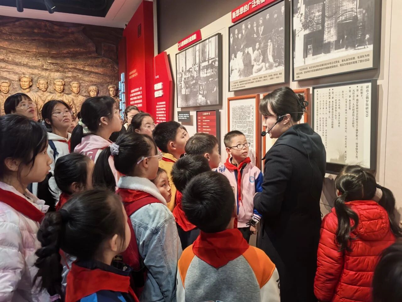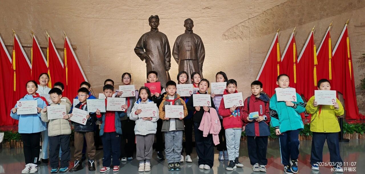 随后,在中共长沙历史陈列馆内,孩子们齐声朗诵毛泽东词作《卜算子·咏梅》。稚嫩而坚定的童声回荡在展厅之中,穿越时空,与伟人的精神世界深情对话。在讲解员的带领下,孩子们透过一幅幅生动的照片、一件件珍贵的文物,共同回望中国共产党的百年奋斗历程,感受那段波澜壮阔的峥嵘岁月。